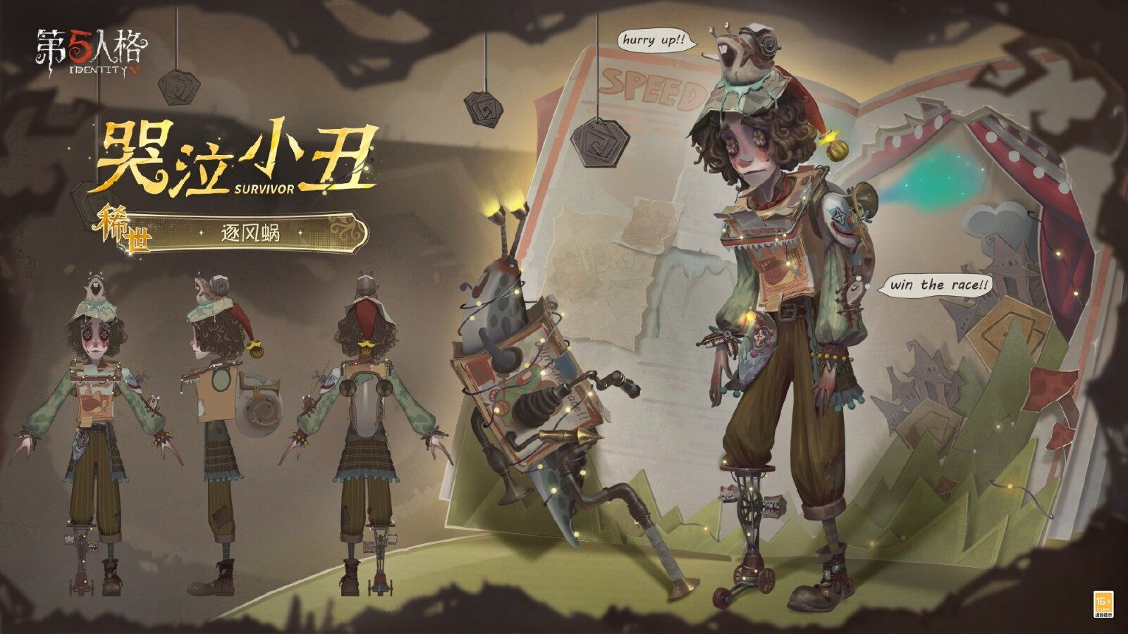 【稀世时装】哭泣小丑-逐风蜗缀着星星的小丑帽被盖在了传单下,厚实的纸箱是带给他安全感的外壳,好胜的伙伴们栖居在头顶与衣袖,不停催促着他的脚步。身后的蜗壳喷出绿色的云雾,为他带来追逐风的动力。袖口与义肢的轮轴上都生长出了小小的牙齿,悄悄啃食着他心中疯狂的念头。被改装的蜗牛缠绕着闪闪发光的灯带,再也不是慢吞吞的角色,它目光炯炯,飞驰如风,抛去了沉重的外壳,但也变成了一具空壳。